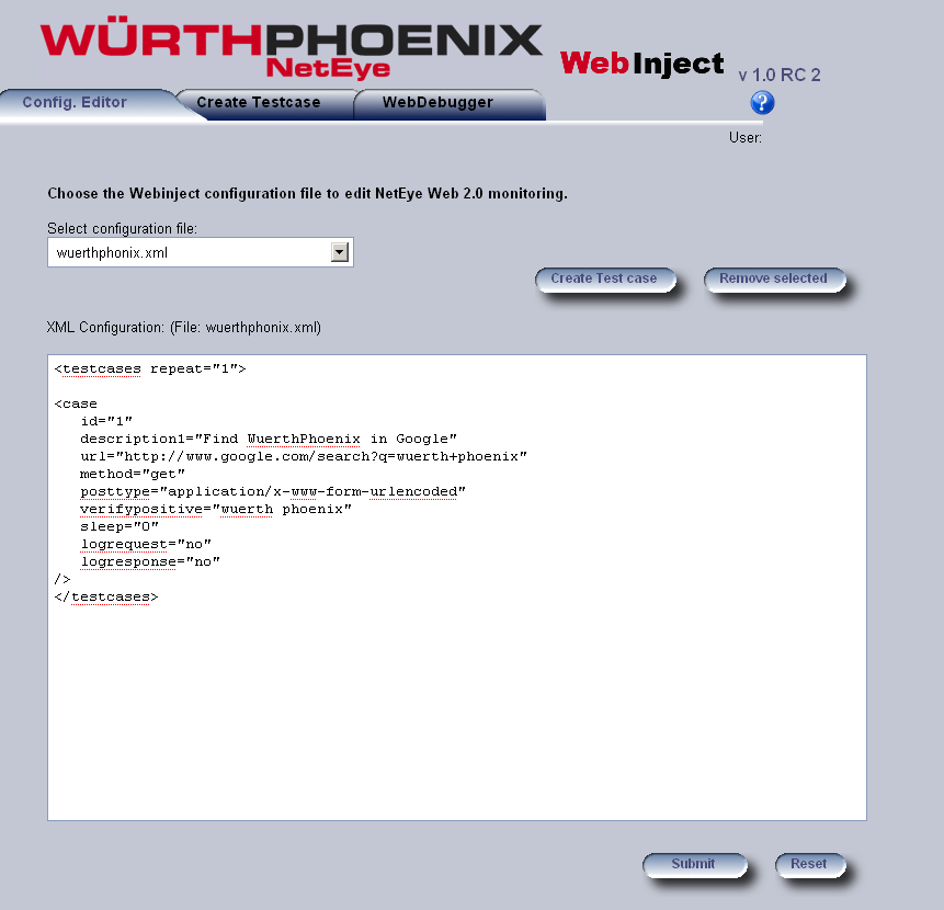 Per implementare il testcase utilizziamo l’interfaccia web di NetEye per la componente Webinject.