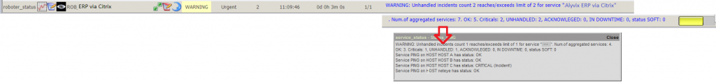 [root@neteye local]# ./check_service_aggregator.sh -s PING -w 1 -c 2 -W 1 -C 2 WARNING: Unhandled incidents count 1 reaches/exceeds limit of 1 for service "PING". Num.of aggregated services: 4. OK: 3. Criticals: 1, UNHANDLED: 1, ACKNOWLEDGED: 0, IN DOWNTIME: 0, status SOFT: 0 | ok_services=3;1;2 critical_incidents=1;1;2 critical_acknowleged=0;; critical_downtime=0;; Service PING on HOST HOST A has status: OK Service PING on HOST HOST B has status: OK Service PING on HOST HOST C has status: CRITICAL (Incident!) Service PING on HOST neteye has status: OK