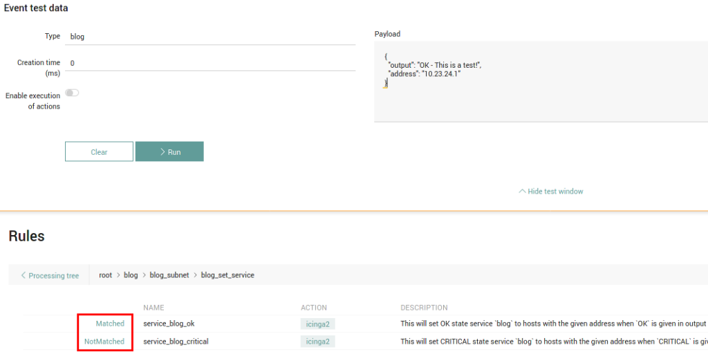 Type: 26^4 possibilitiesIP Address between 20 and 30: 10 possibilitiesThere is one possibility for matching blog and one possibility of matching our octet 24, which means we have an 1/(26^4 * 10) possibility of triggering either the OK or the CRITICAL rule, which is about one in 4.5 million generated events will trigger a passive check result.