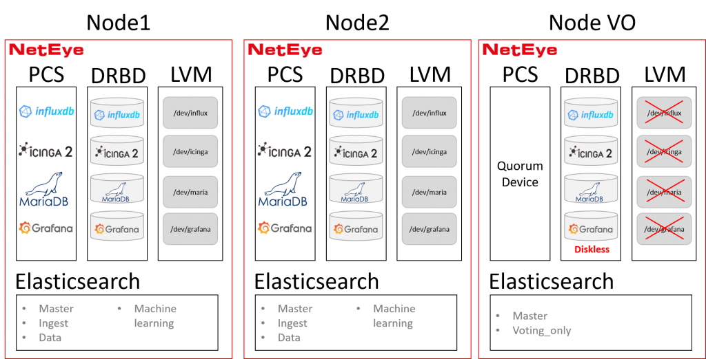 A voting-only node is a NetEye node which circumvents the limitations above. This type of node is a standard NetEye machine with several modifications aimed at reducing resource usage and therefore costs. As the name implies, the only purpose of a voting-only node is to provide a quorum for DRBD, PCS and Elasticsearch: