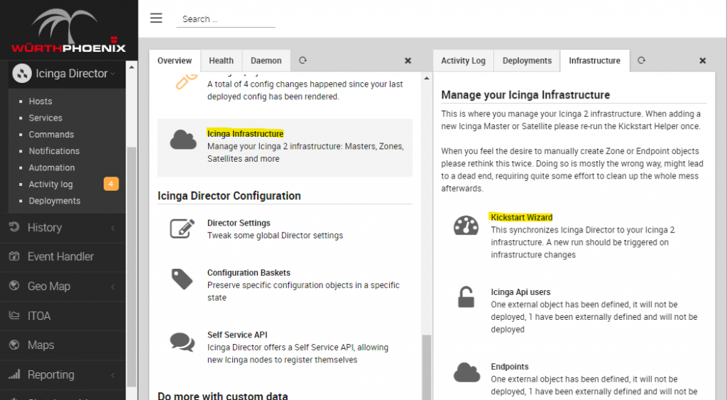 To run the Kickstart Wizard, run icingacli director kickstart run from the command line, or run it from Director by selecting the corresponding section in the Icinga Infrastructure panel.