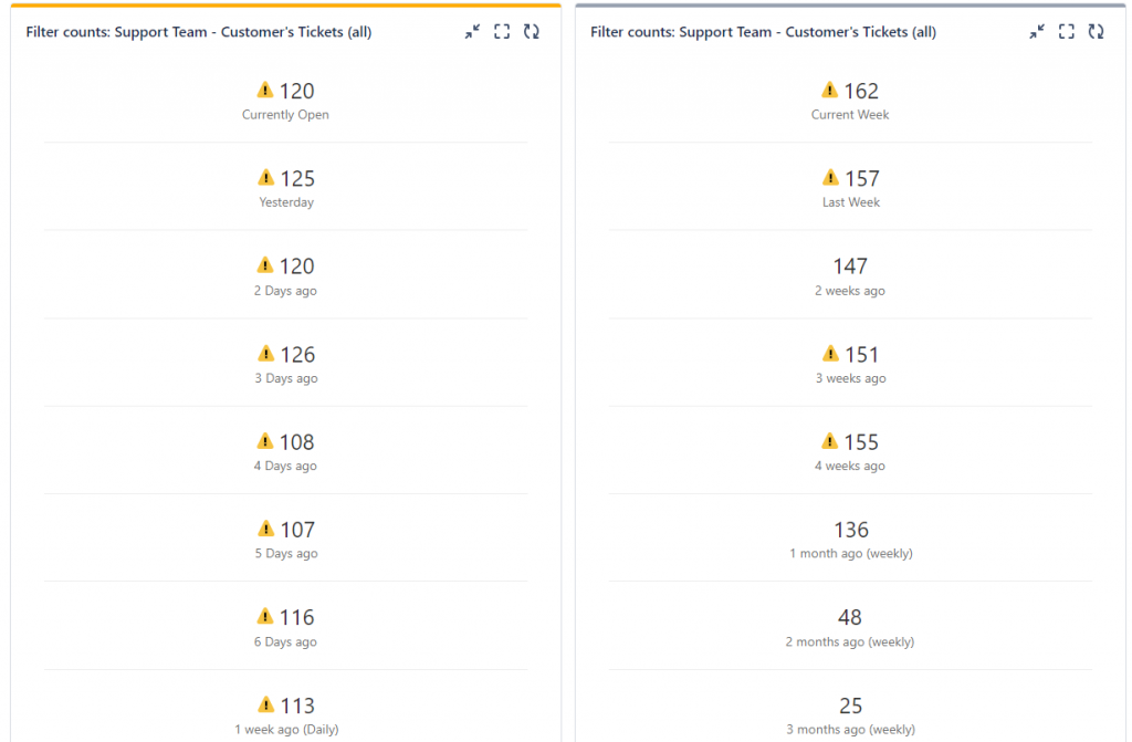 You can now add a new gadget, the “Filter Counts“, that let users define criteria and see how many issues in a filter meet it in order to track your and your team’s workload. In this example, we’re going to use it to count the number of open customers’ tickets both per day and per week.