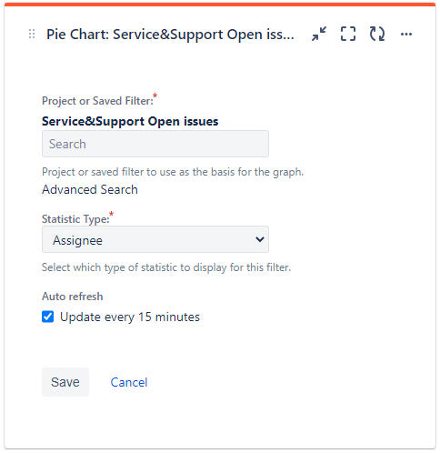 You can now add another gadget to the dashboard: the “Pie Chart”. It displays issues from a project or issue filter, grouped by a statistic type, in pie chart format. Issues can be grouped by any statistic type (e.g. Status, Priority, Assignee, etc.) In this example, we’re going to configure it to show ticket assignation across agents. It will thus help the team in individuating who has a higher workload than others.