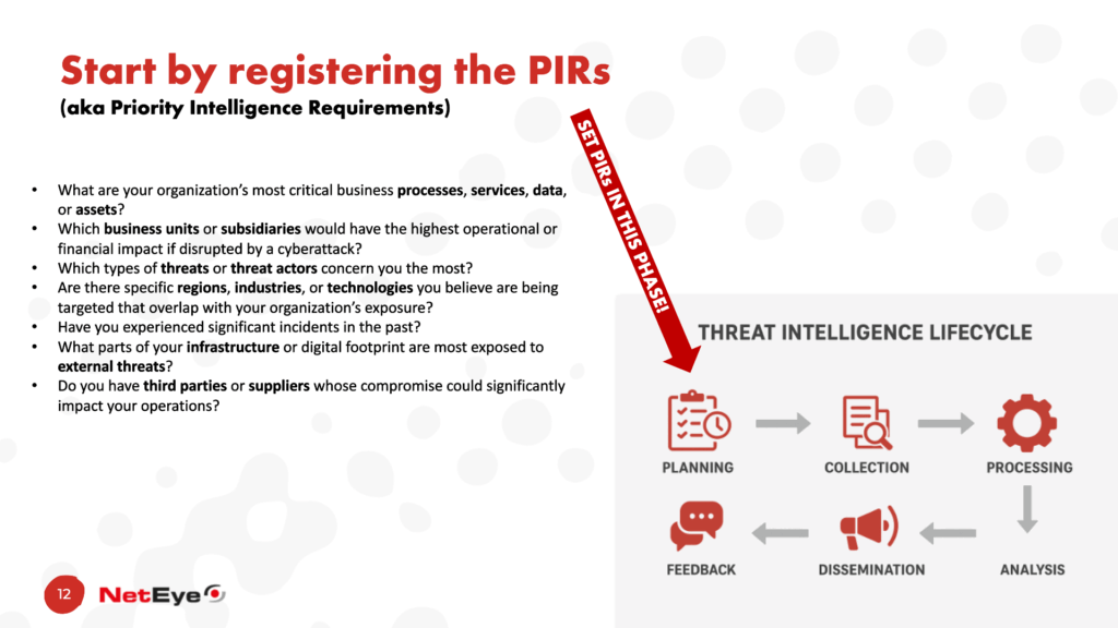 Once the PIRs have been defined (which will still need to be monitored and updated periodically), we can continue our journey with the subsequent phases.