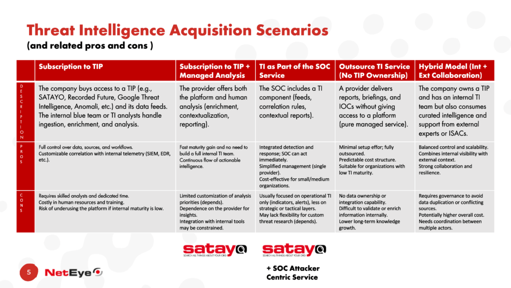 Let’s start with a list of scenarios that provide us with the opportunity to acquire Threat Intelligence within an organization, listing the possible advantages and disadvantages for each scenario: