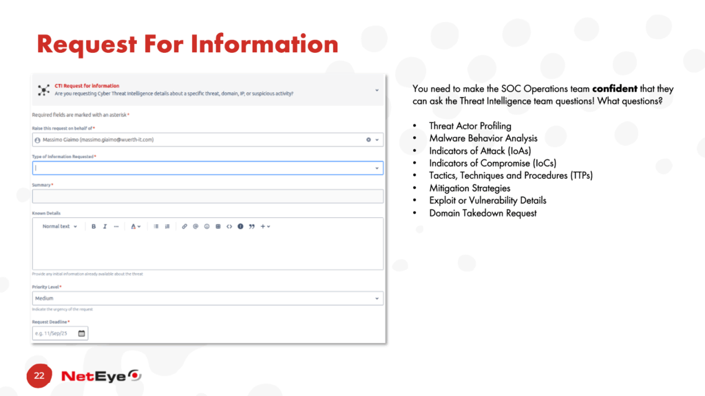 Another element that, in our opinion, facilitates the easier integration of Threat Intelligence into Security Operations processes is the provision of a Request For Information (RFI) module. This tool can be used by different teams to manage analysis requests, on different topics, addressed to the IT team. These requests help build trust between different teams and highlight the value of Threat Intelligence within daily processes.