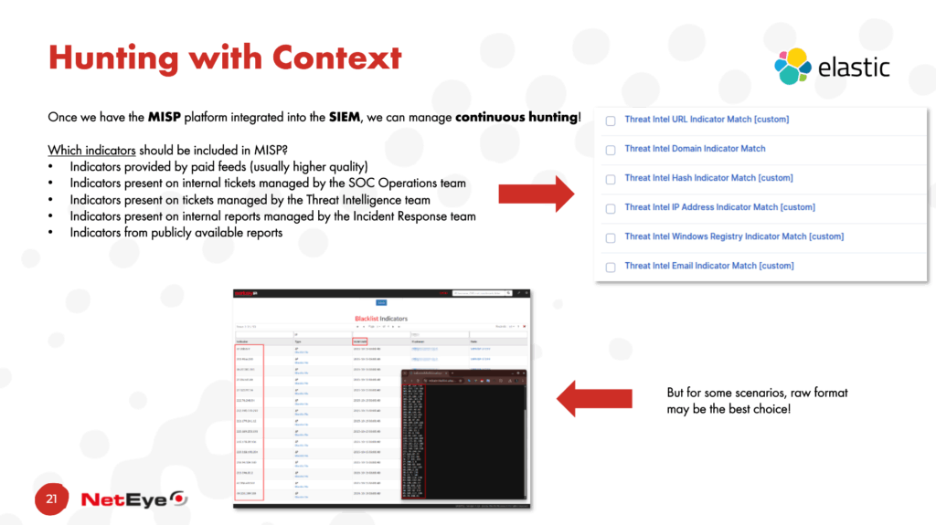 The same indicators made available, enriched and correlated with analysis, within MISP also allow them to be consumed, for example, within a SIEM, with a series of active threat hunting rules that can continuously check whether events related to these indicators are being collected.