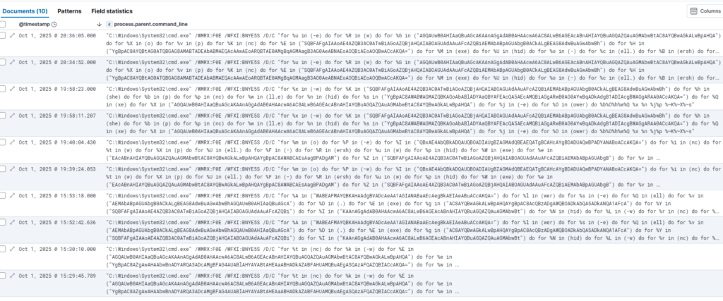 A base-64 encoded PS command was launched on six of our devices. The first part of this malware campaign was a PowerShell command launched at 13:29 UTC on October 1, 2025.