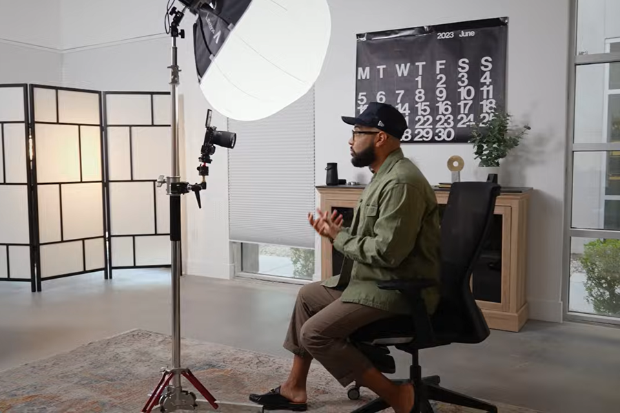 There’s no teleprompter, although you could use one if you want, and since the speaker will always be sitting at the desk, the fixed distance lets you use just about any type of microphone.