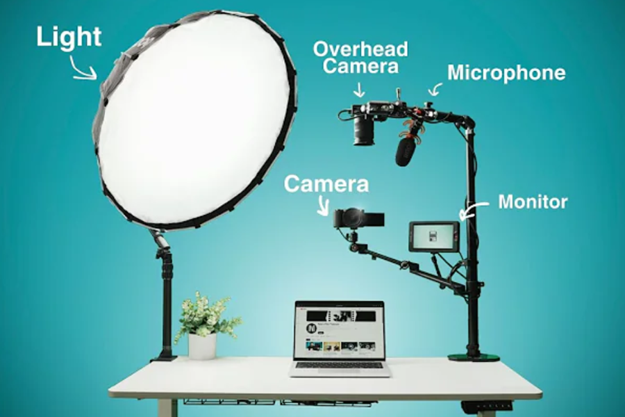 The first all-in-ones were desktop setups. They were a reaction to having a stand or tripod for every element: One for the camera, another for the microphone, a third for a light, then another light, a teleprompter, etc., etc.