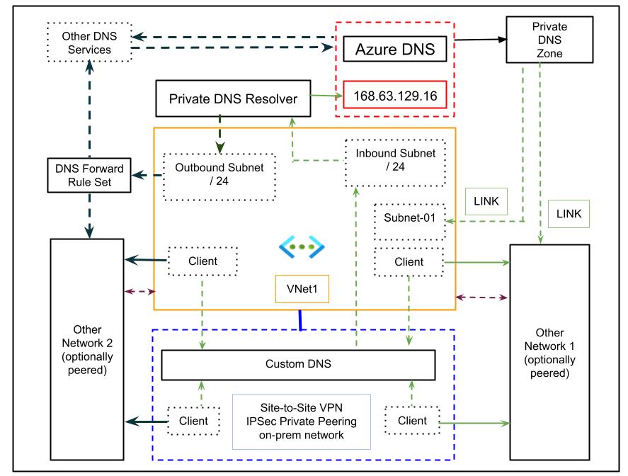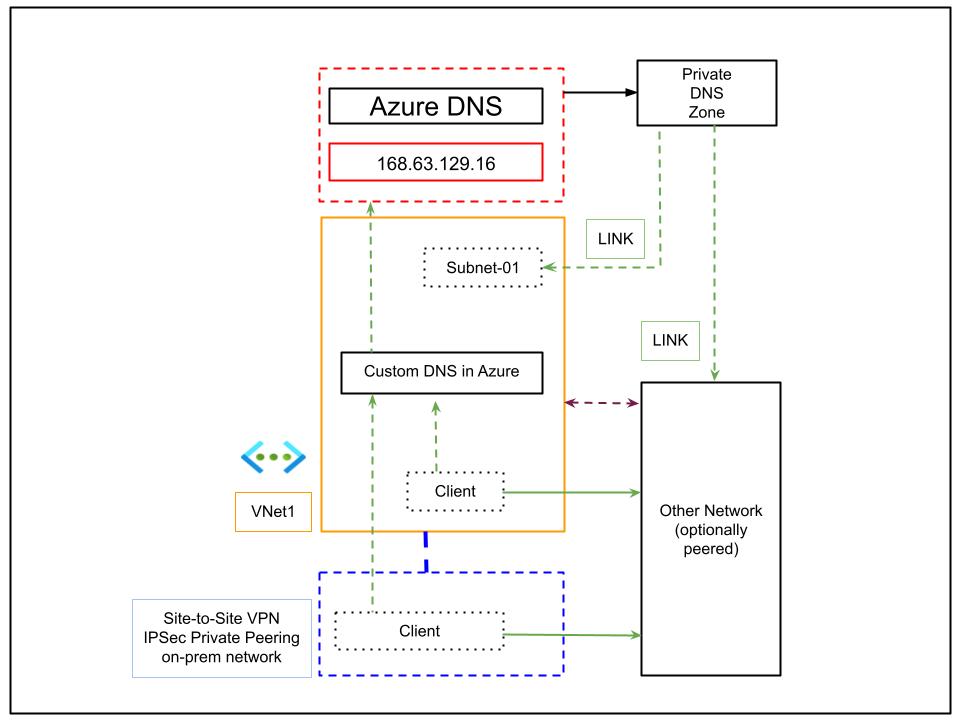 In the diagram above, an on-premises network connects to Azure via Site-to-Site VPN or ExpressRoute. DNS resolution is handled by a custom DNS instance deployed in Azure, which forwards queries for Azure Private DNS zones to the special Azure DNS address, 168.63.129.16. Clients on both on-premises and peered networks use this Azure-based DNS server for name resolution of Azure resources.