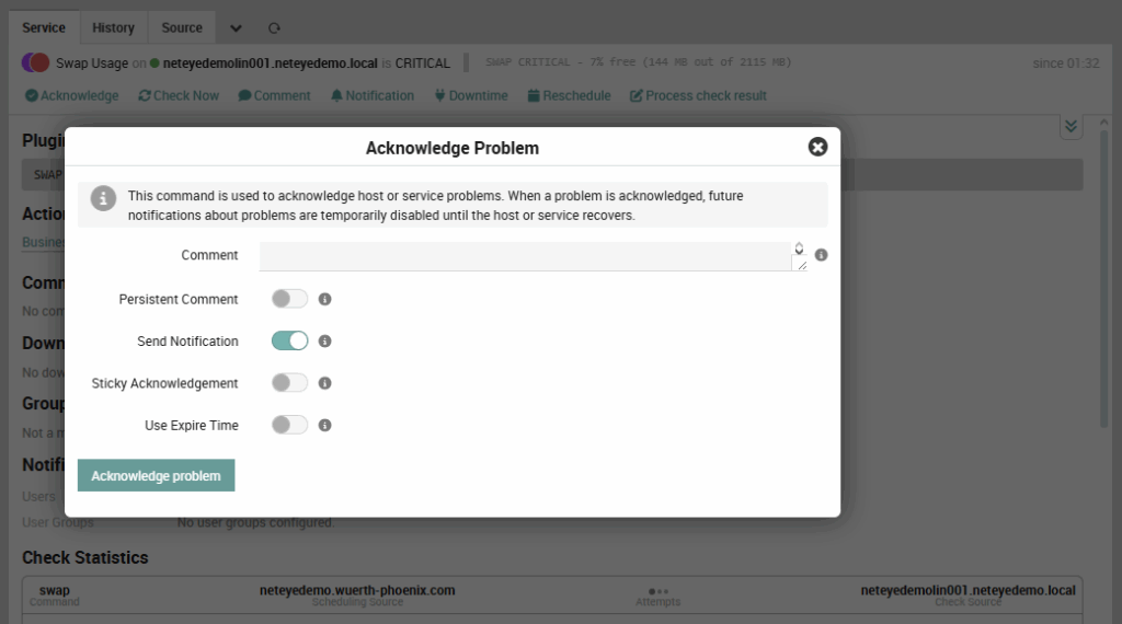Actions requiring input — such as acknowledgements, scheduling downtimes, etc. — now appear in modal dialogs, allowing you to stay on the same page. Bulk operations are also supported, enabling actions on multiple objects at once (e.g., applying a downtime to several hosts/services).