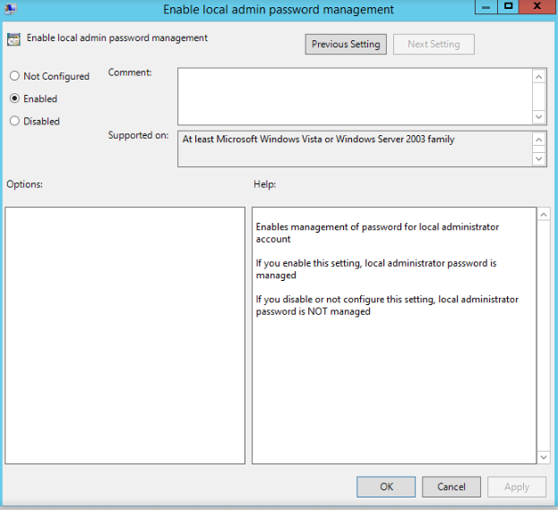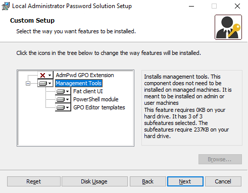 Download the LAPS.msi package from Microsoft and install it on the Domain Controller. Disable the ‘AdmPwd GPO Extension’ and enable all ‘Management Tools’, as shown in this screenshot: