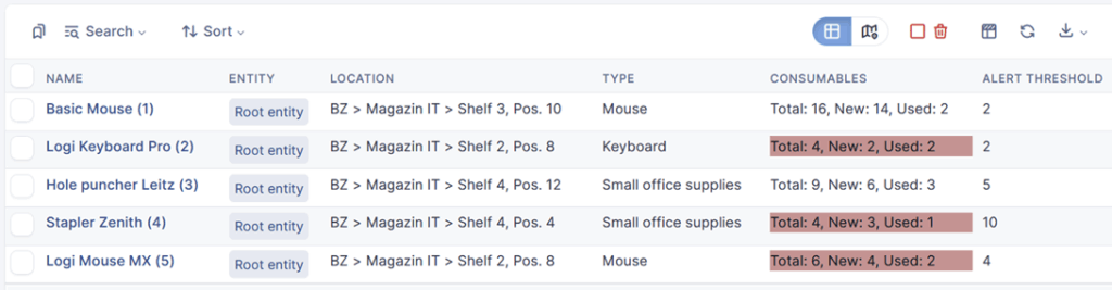 Once you have defined the model, go to the second tab called “Consumables” (same as the menu entry) and add a number of items to the stock. Now, you see a list of items in stock, in state “new”.