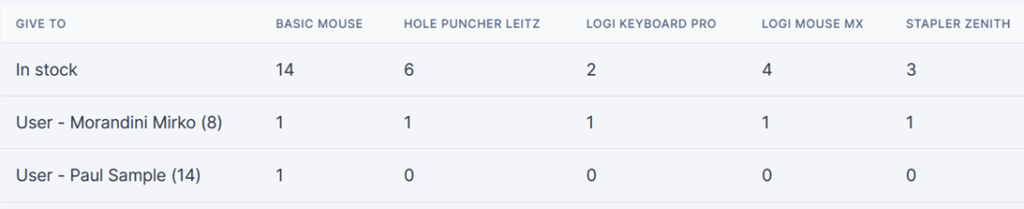 Each time you hand out an item to a colleague or customer, select one from stock and click on Actions Give. If an item is returned, accordingly, select Actions Back to stock.