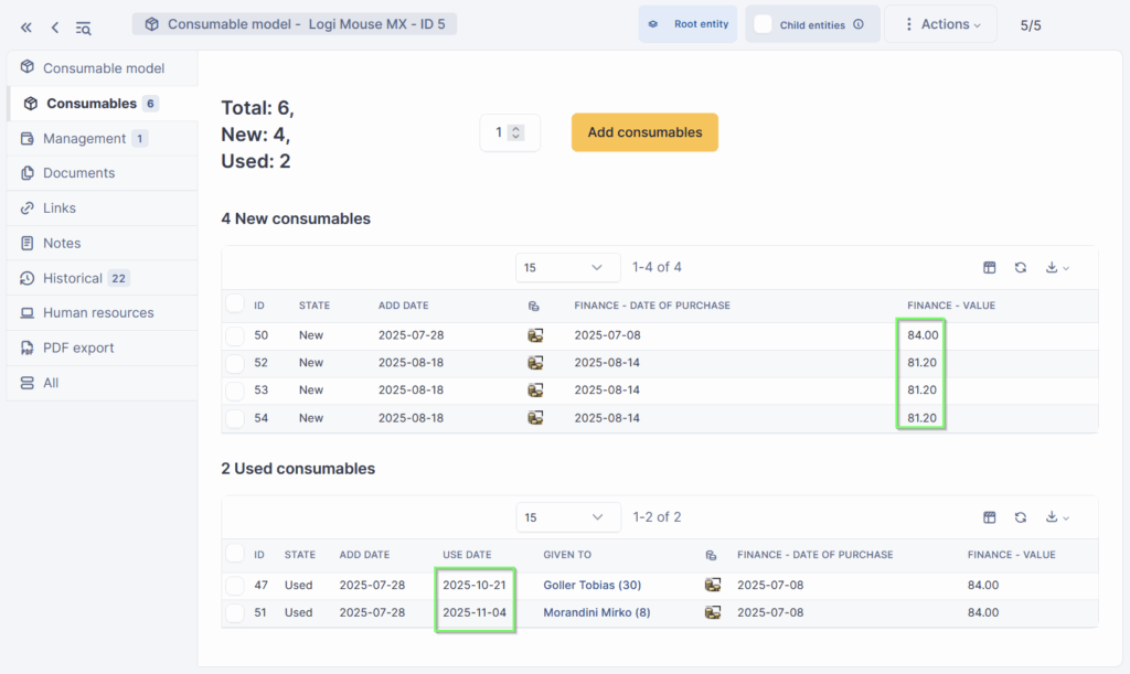 For consumable models, the Financial Management tab has a specfic role, clearly described in the GUI: “For this type of item, the financial and administrative information are only a model for the items which you should add”. Of course, it has no sense to define an order date and number, a delivery date, a specific cost value, a budget or warranty information for a generic model. This data needs to be adapted each time a new order is delivered, and is saved individually to each item you add to the stock. For example, on 07.08.2025 you purchased three keyboards at 84€ each, on 18.08.2025 another three at 81,20€ each. The values of the single items correctly reflected in budget management.