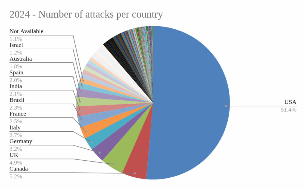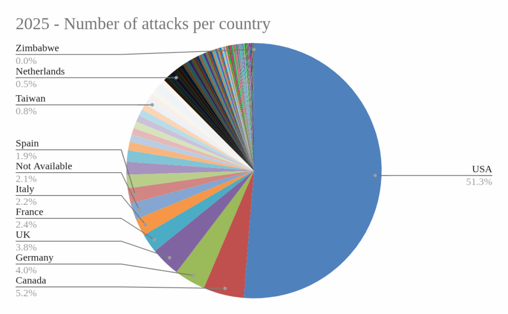 Finally, moving on to the countries most targeted by ransomware gang attacks, the UnitedStates continues to top this unflattering ranking in 2025, with more than 50% of reported attacks being suffered by organizations based in that country. The United States is followed by another North American country, Canada, followed by several European countries (Germany, the UnitedKingdom, France, Italy, and Spain). In total, 139 countries experienced at least one reported attack in 2025, compared to 151 in 2024.