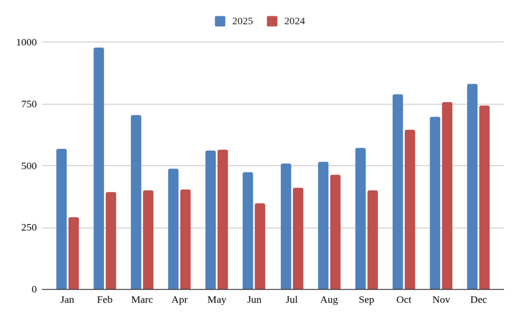 The reported attacks on the DLS of various ransomware gangs in 2025 totaled 7,679, compared to 5,831 in 2024. The increase in reported attacks was therefore 31.69%.