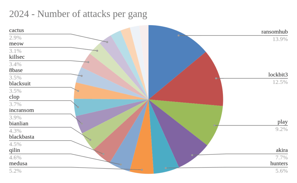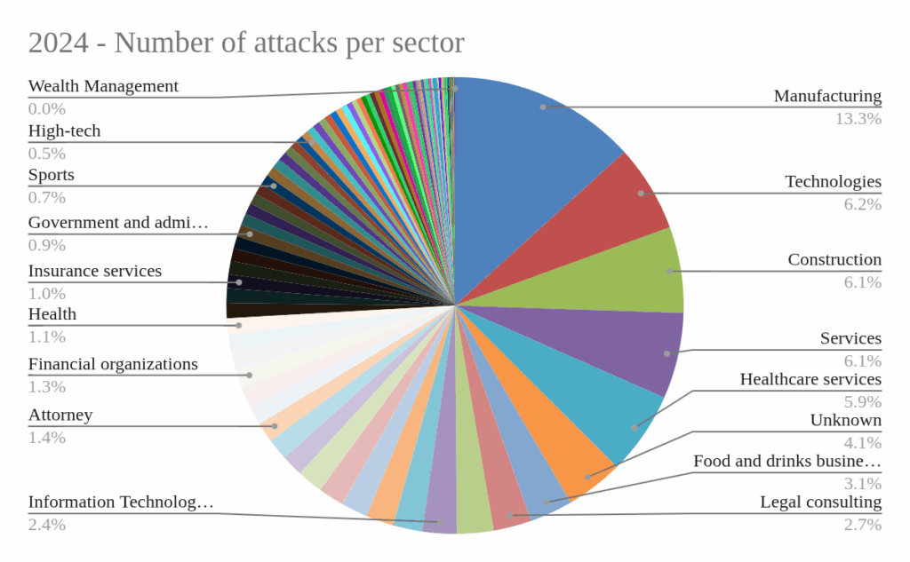 For the first time since we began collecting data on double-extortion ransomware attacks (2020, not including 2019, when we only recorded 33 attacks), the Lockbit gang has dropped out of the top three. This is obviously due to the aftermath of Operation Cronos, which took down much of this gang’s infrastructure in 2024. It’s worth noting, however, that the Lockbit gang has resumed activity in recent months, reporting a total of 92 attacks in 2025.