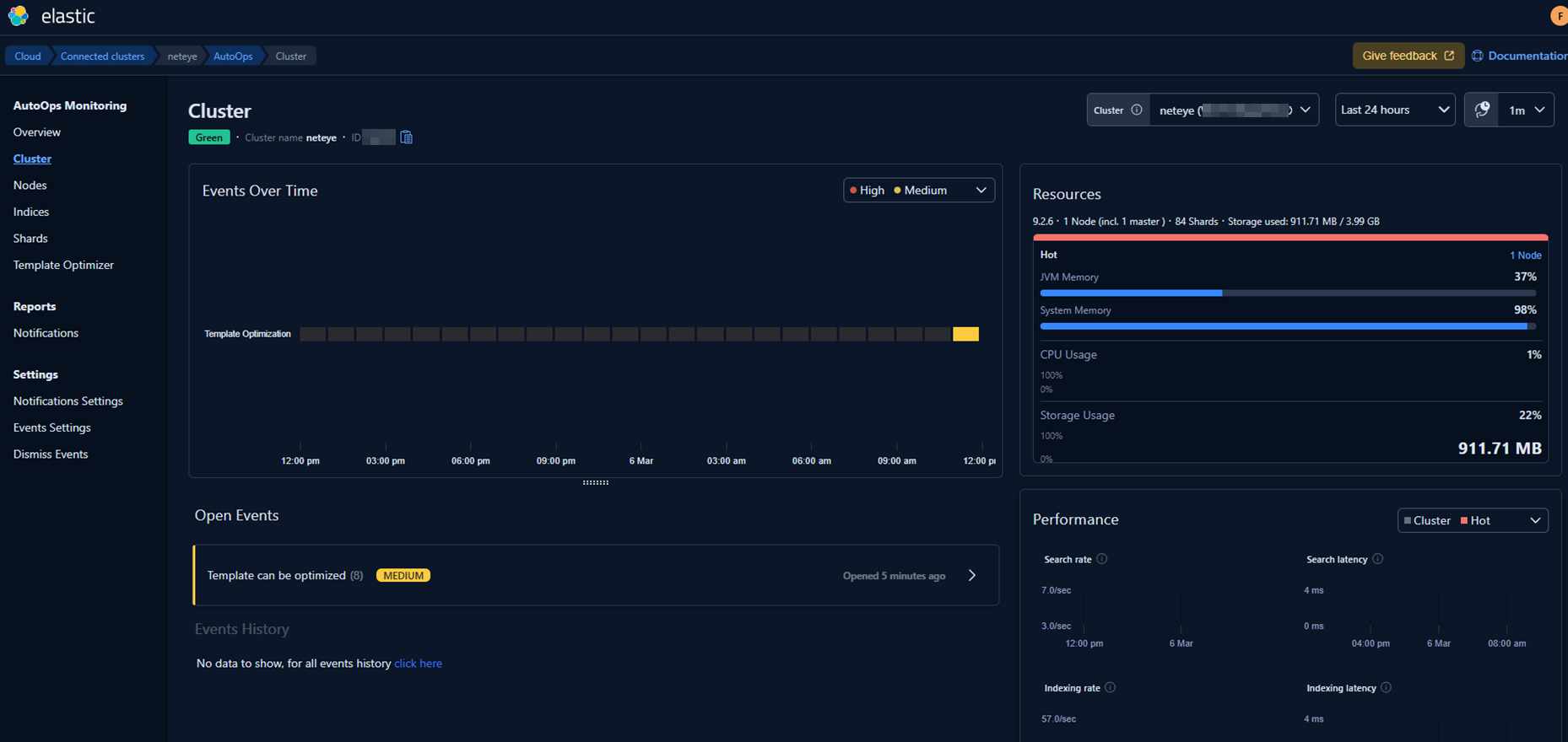 AutoOps continuously analyzes hundreds of metrics from your Elasticsearch environment, providing real-time insights, automated diagnostics, optimization suggestions, and guided remediation steps – all without the need for additional infrastructure or licensing overhead.