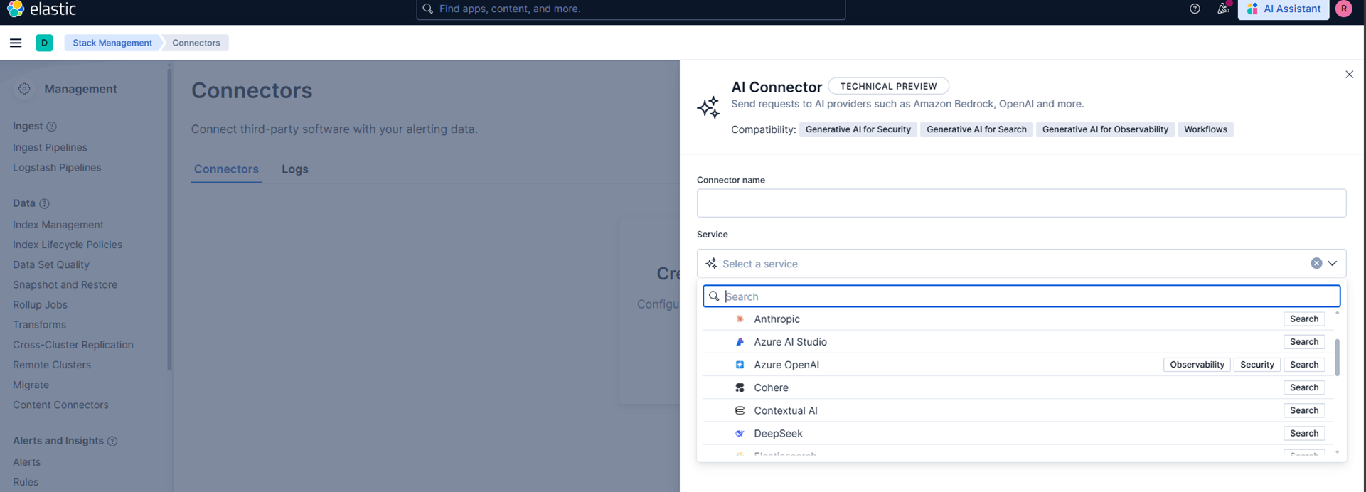 At the same time, with the release of the new Elastic Stack 9.3, which will also be available in the upcoming NetEye 4.47, there will be even more opportunities to test new components, compare behaviors, and understand how these innovations can improve day‑to‑day operational efficiency. One of the best would be Chat with your data: building custom AI agents, based on different connectors on different public AI systems. Here’s a preview image: