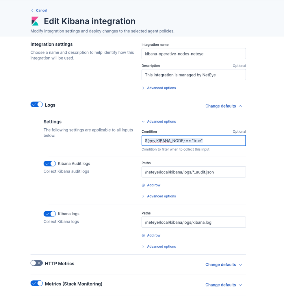 What we did was simple: we set the environment variable KIBANA_NODE to true in the Elastic Agent service, and then enabled the Kibana logs and metrics inputs only when ${env.KIBANA_NODE} == "true" via the Fleet UI, as you can see below.